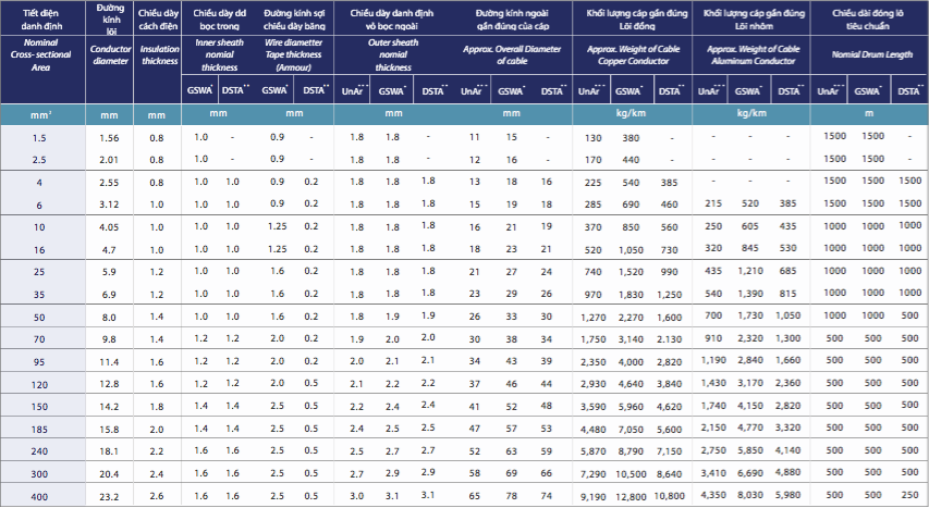 Cáp điện lực 1 đến 4 lõi , ruột đồng, cách điện và vỏ bằng nhựa PVC, dùng để truyền tải, phân phối điện trong công nghiệp, tần số 50Hz, lắp đặt cố định