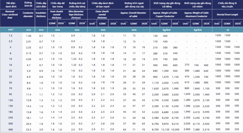 Ứng dụng: Cáp điện lực 1 đến 4 lõi , ruột đồng, cách điện XLPE, vỏ bằng nhựa PVC, dùng để truyền tải, phân phối điện trong công nghiệp, tần số 50Hz, lắp đặt cố định