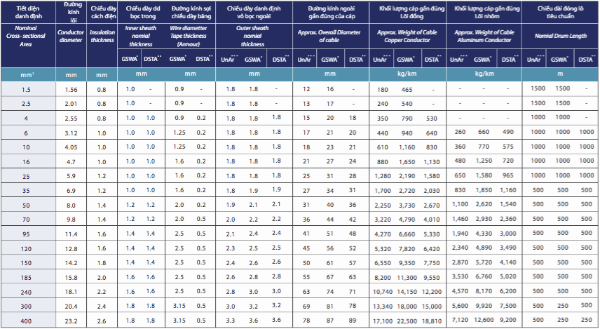 Cáp điện lực 1 đến 4 lõi , ruột đồng, cách điện và vỏ bằng nhựa PVC, dùng để truyền tải, phân phối điện trong công nghiệp, tần số 50Hz, lắp đặt cố định